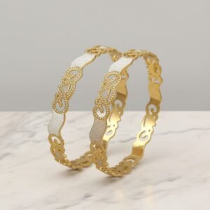 The Regal Bloom Bangle is a beautifully crafted traditional gold bangle for women, designed to showcase timeless elegance and intricate artistry. Featuring a detailed lattice pattern with a graceful floral motif, this bangle reflects classic heritage craftsmanship combined with a modern dual-tone finish.
